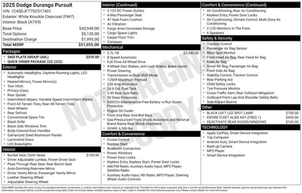 White Knuckle Clearcoat 2025 Dodge Durango Pursuit AWD HEMI 5.7L V8 Multi Displacement VVT 4D Sport Utility 8-Speed Automatic AWD, #7 Seat Foam Cushion, 4-Wheel Disc Brakes, 6 Speakers, ABS brakes, Air Conditioning, AM/FM radio: SiriusXM, Apple CarPlay, Apple CarPlay/Android Auto, Auto-dimming Rear-View mirror, Auto-leveling suspension, Automatic temperature control, Black Left LED Spot Lamp, Brake assist, Bumpers: body-color, Cloth Bucket Seats w/Shift Insert, Compass, Deactivate Rear Doors/Windows, Delay-off headlights, Driver door bin, Driver vanity mirror, Dual front impact airbags, Dual front side impact airbags, Electronic Stability Control, Engine Oil Cooler, Entire Fleet Alike Key (FREQ 1), Four wheel independent suspension, Front anti-roll bar, Front Bucket Seats, Front Center Armrest w/Storage, Front dual zone A/C, Front reading lights, Fuel Tank Skid Plate Shield, Fully automatic headlights, Google Android Auto, GPS Antenna Input, Heated door mirrors, Illuminated entry, Integrated Center Stack Radio, Integrated Voice Command w/Bluetooth, Knee airbag, Leather steering wheel, Low tire pressure warning, Occupant sensing airbag, Outside temperature display, Overhead airbag, Overhead console, Panic alarm, ParkView Rear Back-Up Camera, Passenger door bin, Passenger vanity mirror, Power door mirrors, Power driver seat, Power steering, Power windows, Quick Order Package 22Z, Radio data system, Radio: Uconnect 4 w/8.4" Display, Rear air conditioning, Rear anti-roll bar, Rear reading lights, Rear seat center armrest, Rear window defroster, Rear window wiper, Remote keyless entry, Skid Plate Group, Speed control, Speed-sensing steering, Speed-Sensitive Wipers, Split folding rear seat, Spoiler, Steering wheel mounted audio controls, Tachometer, Telescoping steering wheel, Tilt steering wheel, Traction control, Trip computer, USB Host Flip, Variably intermittent wipers, Voltmeter, Wheels: 18" x 8.0" Black Steel, AWD.